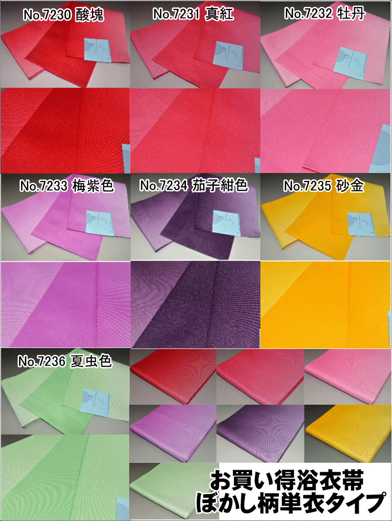 No.7230-酸塊(すぐり)色 No.7231-真紅(しんく)色 No.7232-牡丹(ぼたん)色 No.7233-梅紫色 No.7234-茄子紺色 No.7235-砂金(さきん)色 No.7236-夏虫色 長さ約3m56cm巾約17.5cm ポリエステル100% 日本製